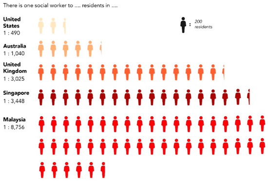 According to Figure 3, as of December 2020, Malaysia has a very low ratio of 1:8756 citizens for the numbers of social workers when compared with countries such as the United States, the United Kingdom, Singapore, or Australia.
