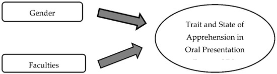Table 3 shows the results of the Pearson Correlation: −0.269. This shows a significant relationship between Trait Apprehension and Gender regarding oral presentations (r = −0.269/p < 0.01). Similarly, to State Apprehension result, the results also show a small correlation to Gender, showing a weak relationship between State Apprehension and Gender. In other words, gender has a slight influence on Trait Apprehension, which includes external factors like speakers being afraid of either their own physical representation, the environment, or even their decision-making process. Students may be afraid of the grades they receive for their presentations, the size and composition of the audience, or even the location and time of the presentation, as well as the negative ratings they may receive from the presentation. This result agrees with another previous study [11], which found that there is a correlation between gender and the state of apprehension for oral presentations; meanwhile, the results differ from those from [14], which found that gender is not a significant factor in communication apprehension.