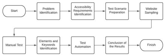The fifth stage is a Manual Test in the form of exploratory tests. The Manual Test was carried out to find unknown web elements in each sample. Once discovered, several accessibility feature usage scenarios were tested for functionality. The sixth stage is Elements and Keywords Identification. For each accessibility feature that passed the Manual Test, its HTML element was identified to find keywords that point to that element. Keywords were used as coordinates in the test automation script. The seventh stage is Test Automation. The automation was performed by accessing the HTML DOM of a web page, and it verified the presence of elements based on coordinates.