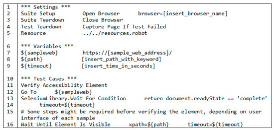 The automation script was written using the Robot Framework (Robot Framework Foundation, Helsinki, Finland). Lines 1–5 define the general settings of the test, such as a set of actions before–after running a suite, after running a test and the resource/library used. Lines 6–9 define variables to store constantly changed values for the sample’s URL, a path with each keyword in Table 3, and the timeout based on the responsibility of the web sample. Lines 10–16 define the test case developed based on the manual test scenario. First, it goes to a specified web address and then waits for the page to load completely. Next, it can directly verify the element, or it needs to go through a few steps before the element becomes visible. For example, the element was nested in a burger menu, so it clicked on the burger menu element before verifying the keyword element.