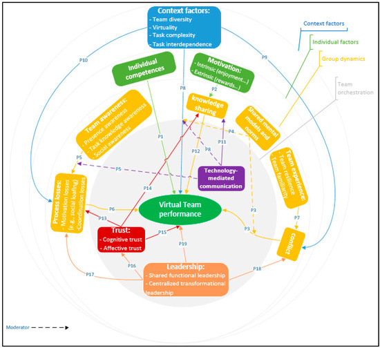 Shared mental models are a common understanding or a form of team knowledge that members have regarding their tasks and how they need to interact in order to accomplish such tasks [17]. DeChurch and Mesmer-Magnus [18] have demonstrated the positive effect of shared mental models on team performance. In a high virtual context, shared mental models play an important role in enabling team members to work together effectively in the absence of direction from a singular leader [17]. On the other hand, shared norms are legitimate, socially shared standards that orient individual behavior. Shared norms enable self-managing VTs to more quickly develop agreements concerning the process of the team’s work [17]. Moreover, setting clear team norms and expectations, and creating opportunities for members to share experiences through repeated interactions, help build trust among members [19]. Finally, when interpersonal norms are established, cultural differences are neglected and, in return, conflicts are reduced [20].