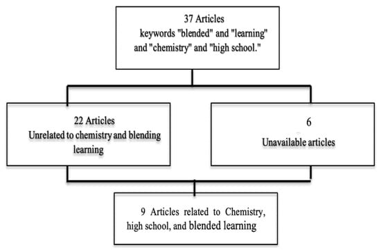 The purpose of this research is to investigate the published papers obtained from the Scopus database from 2008 to 2021 by implementing a filtration search using keywords “blended” and “learning”, “chemistry”, and “high school”. Thirty-seven papers in Scopus were suitable for this study. Twenty-two articles were non-related documents unrelated to chemistry and did not involve high school students, six were non-available pieces, and only eight were used in this research. Figure 1 displays the fundamental steps of searching using the Scopus database searching steps.