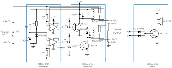 The second part was the SVP, which consisted of a driver transistor and a safety relay. The function of the transistor driver was as a switch to activate the safety relay. This transistor would become active if it received a trigger signal from the comparator in the short circuit voltage detection circuit. At the same time, the relay was selected with one common and two output terminals. Furthermore, the relay was used in the Normally Close (NC) position as a connector of the supply voltage, while it was used in Normally Open (NO) as a voltage breaker in the event of a short circuit.