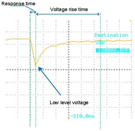 The next stage is the evaluation or testing stage of the circuit. The oscilloscope was used to read the circuit response signal to the short voltage time, as shown in Figure 4. The response time determines the most effective Zener diode value for the protected supply voltage. The response time in Figure 4 is divided into two parts: the work response time, which is seen from high to low waveforms (falling edge), and the response time back to a normal voltage, which is seen from low/common to high waves (rising edge). At the same time, the lowest stress point was taken at the bottom of the lowest point of the waveform.