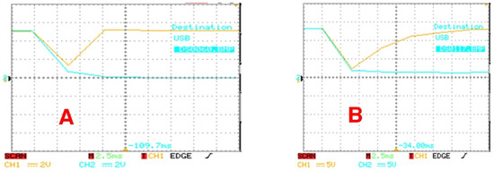 The orange line in Figure 5A shows the response time and the rising voltage time to normal at the output of the IC regulator when a short circuit occurred. The blue line indicated that the relay was working to break the voltage line by the sensor in SVD. However, by disconnecting the voltage from the source, it takes time to reach 0 due to the mechanical relay.