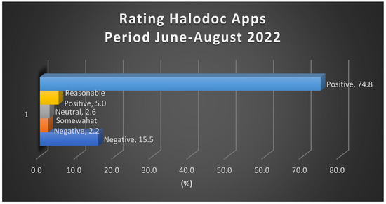 Halodoc app users gave a positive rating of 74.8%, negative 15%, reasonably positive 5%, 2.6% neutral, and 2.2% somewhat negative. This shows that most of the Halodoc application users give positive ratings. According to Tarmidi et al., the better the innovation offered by telemedicine applications at affordable prices, customer satisfaction will increase [11]. Therefore, if Halodoc users increase their satisfaction after using the application, it will certainly give a positive rating. Reviews from users are valuable input compared to professional reviewers who do not have experience using the app in real-time when you need it [12].