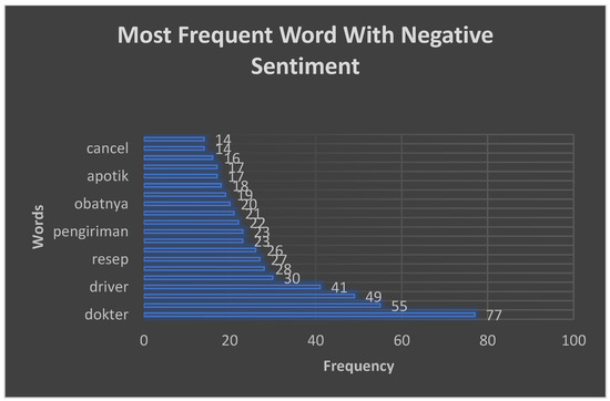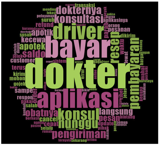The qualitative phase is to visualize the words that often appear and analyze the factors that telemedicine application users complain about using NVIVO (QSR International, Burlington, MA, USA). The visualization outputs of frequently occurring words are negative and positive word frequency query results and negative and positive world cloud sentiments. Researchers use the word count feature in NVIVO to identify critical themes obtained from big data. The set keywords are 4–5. The keywords obtained are to increase the researcher’s understanding of the phenomena that occur as a guide for topics that will be analyzed further [10]. In improving Halodoc services, it is necessary to know the factors many telemedicine application users complain about into four aspects, service, payment, system, and place [4].