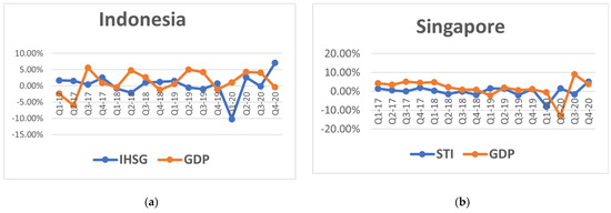 Stock Index and GDP in Indonesia in 2017–2020 in (a) Indonesia; (b) Singapore; (c) Thailand; (d) Philippines. (Source: Processed by the Author, 2021).