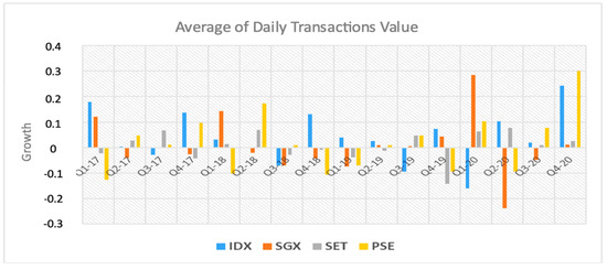 Based on Figure 2, it can be observed that there were change in the average growth of the average daily transaction before the COVID-19 pandemic. The average daily transaction value of the four exchanges experienced less volatile growth, with the highest growth not reaching 0.2% in each quarter. However, when the pandemic occurred, the four exchanges showed an aggressive response, as seen in Q-1 of 2020; the Indonesia Exchange showed a very sharp decline in transaction value and this is because in early March 2021, the first COVID-19 case was announced in Indonesia; thus, the decline can be interpreted as a decrease in transactions that occurred on the Indonesia Exchange. When the pandemic occurred in Indonesia, investors behaved as though transacting in the stock market was not interesting and not a good idea [15]. From these observations, it can be concluded that Indonesian investors prefer to wait and see action to respond to this information; however, in Q-2, when the peak of the pandemic occurred until the end of 2020, the average value of Indonesian transactions showed positive growth and the highest growth of the last 20 years even occurred in Q-4.