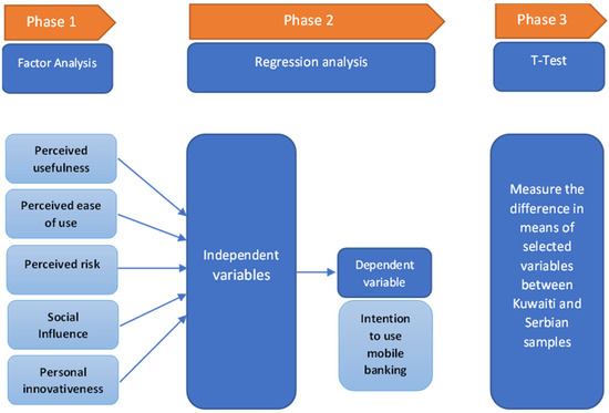 The study used a descriptive and causal research design; the sample consisted of 900 university students from Kuwait and Serbia. Figure 1 presents the three phases of the study. Firstly, using confirmatory factor analysis, it will be checked if the selected adoption factors from the literature review are appropriate for our sample. In the case of a rejection of the measurement theory, the new extracted factors will be used to proceed with a regression analysis. The second phase will be the construction of two regression models (one for Kuwait and one for Serbia), using the factors, instead of the original variables, for estimating the probability of increasing the intention to use mobile banking. Finally, the two regression models will be compared, and t-tests will be conducted to identify the differences between the means of the selected variables from the Kuwaiti and Serbian samples.