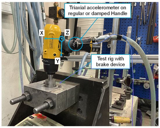 The measurement procedure was conducted according to the general guidelines described in ISO 28927-2. However, the procedure was slightly simplified by using one machine run by only two operators. In addition, the time signals that were obtained from the triaxial accelerometer mounted on the tool handle by using double-sided tape and a cable tie were acquired with a sampled frequency of 65,536 Hz. The recorded data were then analyzed by applying a low-pass filter at 10 kHz in order to conform to the useable frequency range of the accelerometer. For the measurements, the nutrunner was operated in the appropriate brake device at the maximum rated torque, as shown in Figure 1. Each of the two operators performed five runs of 10 s initially on the nutrunner with a regular handle (new tool from factory) and then on the same machine with a damped handle. The regular handle for this type of nutrunner is made of an aluminum core covered by hard rubber. The dampened handle consists of a 2 mm layer of soft rubber glued to the aluminum core and then covered by the hard rubber.