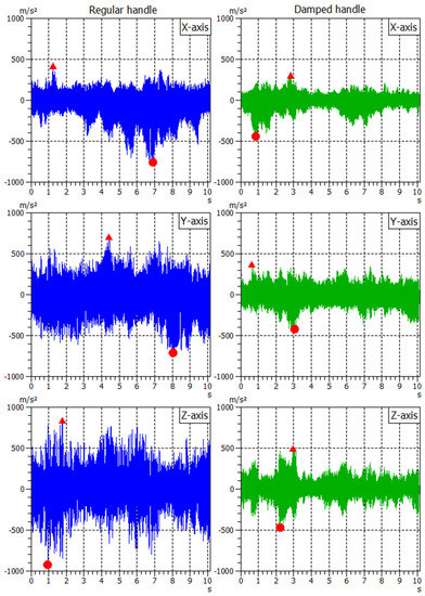 In Figure 2, the time signals of the accelerations recorded by the triaxial accelerometer are shown in the X-, Y-, and Z-directions for two runs, where one run was performed on the regular handle and the other run on the damped handle. The signal amplitudes can vary significantly during a triggering sequence. Nevertheless, the signal amplitudes are clearly reduced by using the soft layer of damping material, especially in Y- and Z-directions.