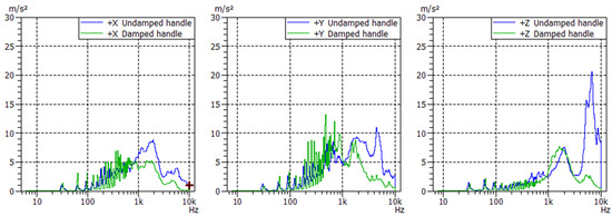 The acceleration spectra obtained by averaging the vibration data from the ten runs are presented for both tool configurations in 1/24th octave bands in X-, Y-, and Z-directions, as shown in Figure 3. A large reduction of the acceleration amplitudes can be observed at frequencies above 1–2 kHz, whereas an increase in the acceleration levels can be viewed at the frequency range below 1 kHz, particularly in the Y-direction. This increase may be attributed to a resonance that is implied by the mounting of the accelerometer on the handle.