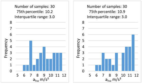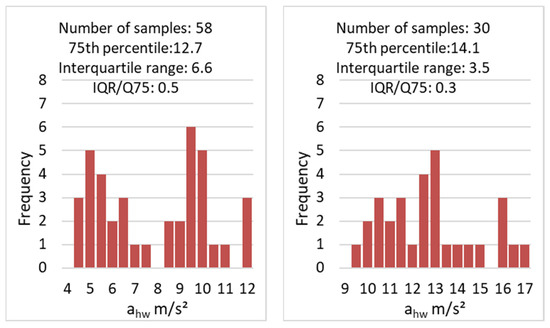 The number of measurements in the data sets ranged from 21 to 216 and the median number was 30, with a 75th percentile at 11.24 m/s² and interquartile range of 0.29 m/s². Figure 1 shows examples of vibration total value distributions for two machines, a random orbital sanderm and a demolition hammer.