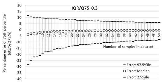 Analysis was performed for five different IQR/Q75 values tested, from 0.1 to 0.6. Clearly, larger interquartile ranges led to larger error ranges. Table 1 illustrates how the error range depends on the IQR/Q75 value for sample sizes of 20 and 30 measurements.