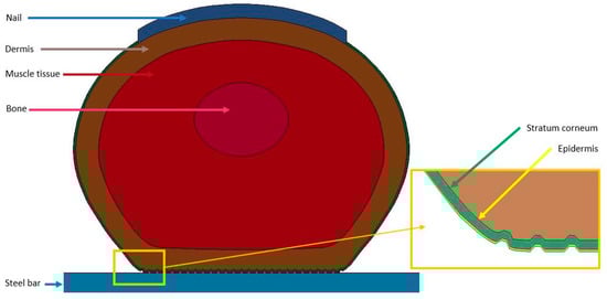 The model of a schematic fingertip is shown in Figure 1. This model includes the major components of the human skin, i.e., stratum corneum, epidermis, dermis and subcutaneous tissue. The geometric properties of the different skin layers and the overall dimensions of the finger were derived from findings published in [2,3]. Special attention is paid to the contour of the fingerprint where load introduction appears. The 3D contour was scanned with imaging confocal microscopy and parametrized. The dimensions were integrated into the simulation model. The model consists of 63,500 2D elements (plane strain) located in the global xy-plane. Element sizes range from 0.01 mm (the smallest) in the stratum corneum to 0.08 mm in the bone. A fully integrated 2D plane strain element formulation with four in-plane integration points was used throughout this work, counteracting any spurious deformations, i.e., hourglass modes. This continuum element enables the use of material models corresponding to 3D continuum elements.