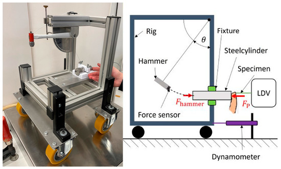 The experimental setup is shown in Figure 2. It generates a vibration pulse with high repeatability and amplitude, similar to ordinary hand-held impact wrenches. From this experiment, the acceleration of the steel surface was extracted. After post-processing, this signal was used as the input for the FE model to avoid numerical disturbances. The response in the nail was measured up to 100 kHz using a laser Doppler vibrometer (LDV) that registered the resulting accelerations at the nail tip. The signal was sampled at 1 MHz.