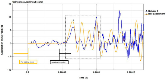 The measured response of the nail acceleration in the experiments was used to compare the experiment with the simulations using the model (Figure 3). The correlation for the first measured acceleration peaks, which are considered to be of utmost importance, was fairly good between the experiment and FE simulation, as can be seen in Figure 3. Then, the correspondence deteriorated, even though some peaks were later comparable.