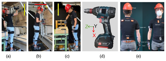 (a–c): Test setup for examining the three working directions, indicated by arrows, (d): impact wrench with a triaxial accelerometer, (e): wireless measurement system for body posture (sensor attachment).