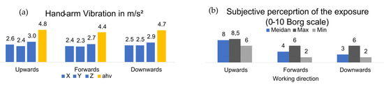 Figure 2b shows the test subjects’ perceived rating of the vibration and posture exposure, using the Borg scale. While the test subjects rated the combined exposures as “very strong”, when working in the upwards direction (median 8), the combined exposures in the forwards (median 4) and downwards direction (median 3) were rated as medium.