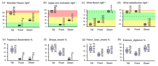 (a–d): Posture analysis for three working directions while using an impact wrench for different angles, colour coding represents: green for neutral posture, yellow for moderate posture and red for awkward posture, (e–h): electro muscle activity in three working directions for different muscles.