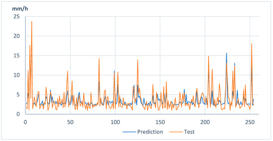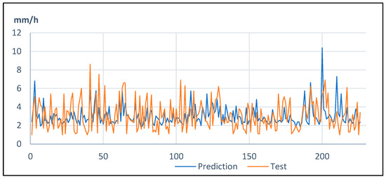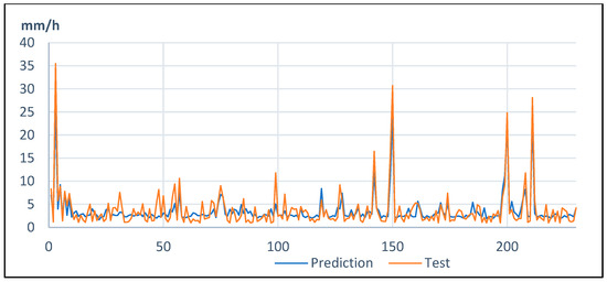 Finally, at Shimabara station, peaks superior to 10 mm/h are well predicted, although the value is slightly underestimated. Peak rainfalls of 10 to 15 mm/h also show two occasions when the peak rainfalls were slightly overestimated (between the samples 200 and 250). The model also finds peak rainfalls between 5 and 10 mm/hour (Figure 6), but they are underestimated.