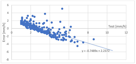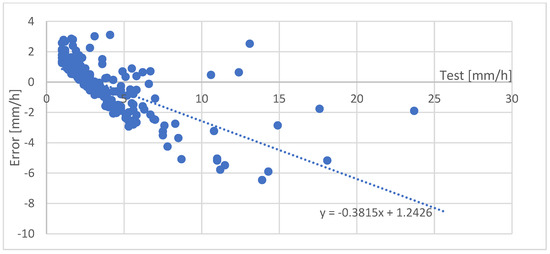 To understand the importance of these errors: the error of the values of the rainfall against the test events shows that an hourly rainfall of 15 mm/h and higher are systematically underestimated. The worst estimate was for Mt. Unzen station when 35 mm/h was underestimated by 10 mm/h (Figure 7). The two other stations near sea level showed lower errors, with error values less than 4 mm for most values: only two values exceeded this error at Kuchinozu and a dozen at Shimabara station (Figure 8 and Figure 9). This issue emphasizes the necessity to separate the data of different seasons and from different wind directions in order to work on the topographic effects, which may affect the correspondence between the values of the XRAIN dataset and the rain gauge station.
