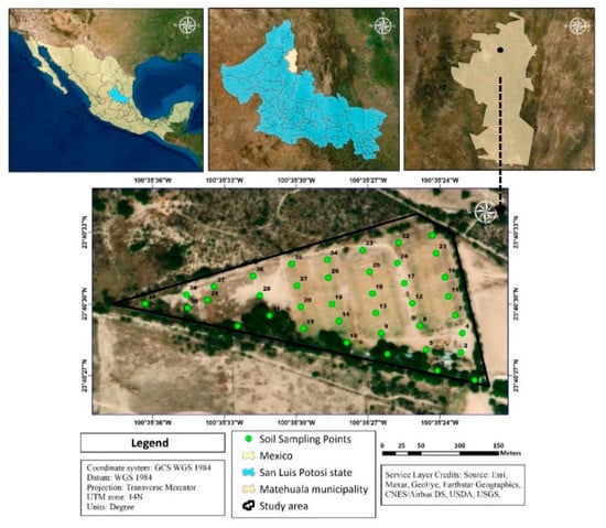 The selected study area is located between 23°40′30″ N latitude and 100°35′27″ W longitude around Joya Verde soccer sports club, a non-cultivated farming area of Cerrito Blanco, Matehuala municipality, San Luis Potosi, Mexico, with a total land area of approx. 4.84 ha (Figure 1). The soccer club is around 14 years old, and it includes three soccer fields. It is surrounded by semi-arid vegetation and underdeveloped agricultural farmland [,]. The mean annual temperature in this area is 14° celsius. The rainy season lasts from June to September, with a 300 mm average rainfall [,,].