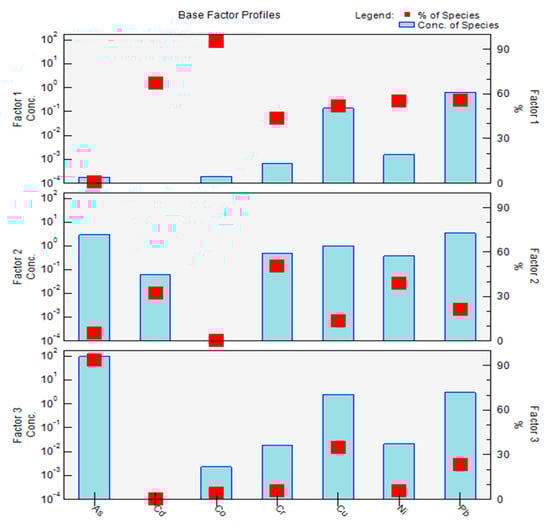 PMF is a receptor model that the United States Environmental Protection Agency has recommended to analyse the different types of sources of environmental pollution [,,]. This model was developed by Paatero and Tapper (1994) []. A matrix of speciated sample data is divided by the PMF model into two matrices: factor profiles () and factor contributions () []. In this research, the PMF 5.0 model was implemented to source identification of heavy metals in the surface soils.
