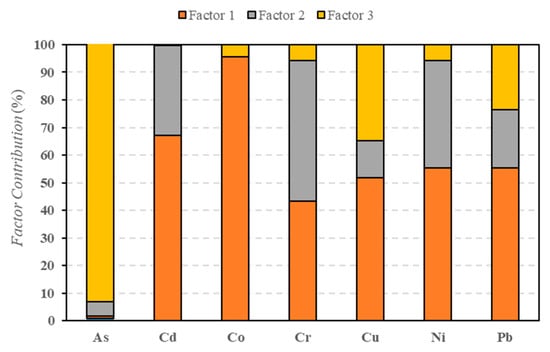 Factor 1 showed a significant positive load of Co, Cd, Ni, Pb, Cu, and Cr in the source contributions and were close or below to the permissible limit standards derived from the surface soil. Therefore, the results were revealing that factor 1 is a significant lithogenic source. The concept of ionic reaction may be able to explicate the clustering characteristic resulting from PMF, since the concentration values and correlations of heavy metals may fluctuate across various parent materials. According to the spatial distribution mapping of factor 1, the study area’s western side which is surrounded by semi-arid vegetation contains the majority of the high-value locations (Figure 4). This result was in line with the concentration–distribution patterns of Co, Cd, Cu, and Ni where significant concentrations of these heavy metals were found close to each other. The average concentrations of Co, Cd, Cu, Ni, and Pb were close to their respective permissible limits; hence, they could be of natural origin. Therefore, factor 1 might be classified as a natural source.