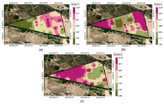 Spatial distribution of PMF source factors in the surface soil: (a) Factor 1; (b) Factor 2; (c) Factor 3.