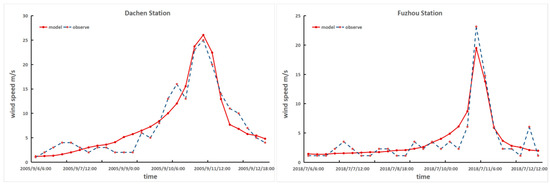 Based on the wind field model, it is possible to simulate the instantaneous wind field at any given time and obtain the maximum wind speed during each typhoon track. We use = 0.03 m for standard B landforms (field, countryside, jungle, flat open land) and = 0.01 m for A landforms (sea, coast, open water), referring to [12]. This paper simulates the distribution of wind fields passing through the southeast coast over 60 years from 1960 to 2019. To verify the reliability of the model simulation results, we compared them with the actual wind speed measured at the stations. Typhoon Kanu in 2005 (Typhoon 0515) and Typhoon Maria in 2018 (Typhoon 1808) are selected for analysis and validation at the Dachen and Fuzhou stations, respectively.