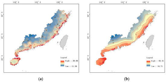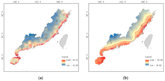 Figure 4 and Figure 5 show contour maps of the extreme wind speed at 50 and 100 years on the southeast coastal areas of China. We can see that the wind speeds in the coastal areas vary considerably with a certain gradient shape and a clear stratification phenomenon. The contour maps of extreme wind speed in both the station-based and grid-based data, the former having a higher overall extreme wind speed than the latter. Nonetheless, grid-based results have a more pronounced overall trend for the weakening effect of land on typhoon wind fields after landfall than station-based. This is because the grid data is more evenly distributed and dense, and better able to reflect the immediate changes in the wind field compared with station data.