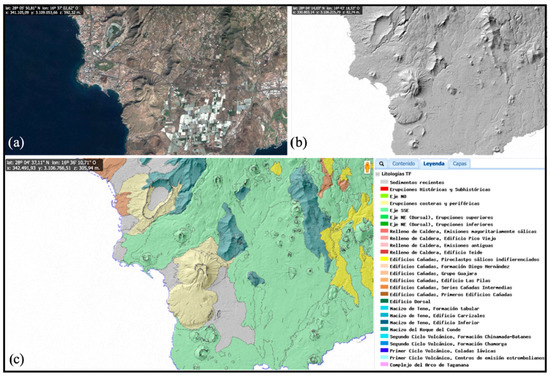 Tenerife South transect maps used for the teaching sheets: (a) ortophoto; (b) hill shade image, and (c) geological map. Source: Visor Grafcan-IDECanarias (https://visor.grafcan.es/visorweb/), accessed on 1 May 2022.