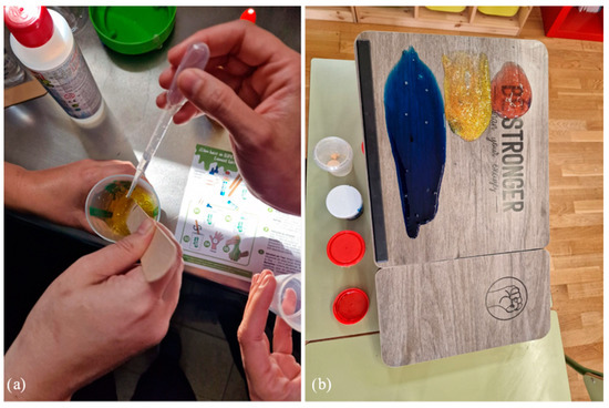 Workshop evidence: (a) production of polymeric fluids (slime) with different viscosities; (b) slime race experience in the classroom.