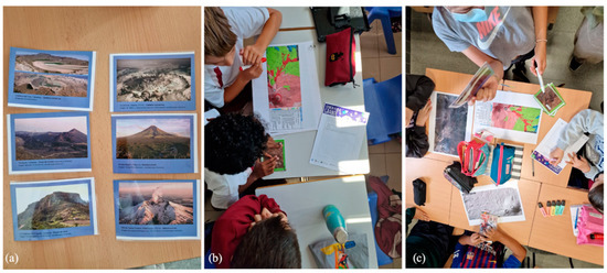 Workshop evidence: (a) cards of volcanic buildings of volcanoes of the world (own production); (b,c) primary school students working with the cards, maps, and field notebooks.