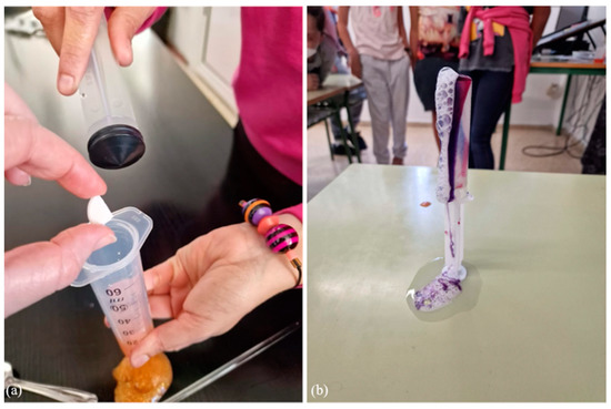 To obtain a better understanding about the explosiveness of a volcano, a simple experiment was carried out. With this intention, the eruptive process was simplified by using the phenomenon of effervescence, which allows a rapid accumulation of gases inside a container. In this case, the container was a 5 mL syringe filled with slime and water, to which an effervescent vitamin tablet was added. The syringe represents the magmatic chamber in which the gases produced by the effervescent tablet accumulate. The outlet of the syringe was plugged with 1 mL of slime, which prevented the gases from escaping. The more liquid mixtures emerged from the syringe in a fluid form, while the more viscous mixtures clogged the hole until they reached a pressure that caused them to come out explosively. Finally, a highly explosive volcano was simulated using a film canister, where the lid represented the highly viscous magma. This experiment amazed both pupils and teachers. You can see an example of this activity in Figure 4.
