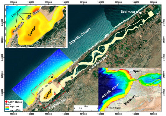Lagoons, in particular, represent 13% of the world’s coastline [2,3,4]. These coastal ecosystems are relatively isolated from the open ocean by coastal barriers that allow for communication between channels and inlets. Some lagoons have a maximum depth of more than 30 m, although the average depth is rarely greater than 2 m [5]. Traditionally, lagoons have been very beneficial to humans, providing both high biological productivity and port and navigation facilities. However, these coastal ecosystems are actively affected by interactions between terrestrial, marine, and atmospheric processes and are most sensitive to a variety of natural processes, including global climate change and also human activities [6]. For these reasons, the permanent assessment of hydrodynamical, sedimentological and ecological states of these ecosystems is of paramount importance for understanding their natural evolution and supporting decision making in these complex coastal environments.