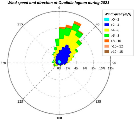 The wind rose of one year’s data (2021) observed at the inlets of the lagoon of Oualidia is presented in Figure 2 (Source: https://www.ecmwf.int/en/research/climate reanalysis, accessed on 1 January 2022). The wind rose analysis shows that the prevailing winds are generally northwest, from north to northeast, with a very strong predominance of north to northeast winds, as described by [7,8]. Annual wind statistics offshore of the Oualidia lagoon indicate that the annual mean winds have speeds ranging from 2 to 10 m s−1. Thus, the study of [9], showed that the annual average winds have speeds ranging between 4 and 9 m s−1, with predominantly northeasterly and northerly directions.