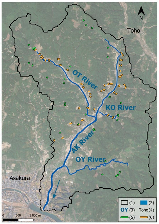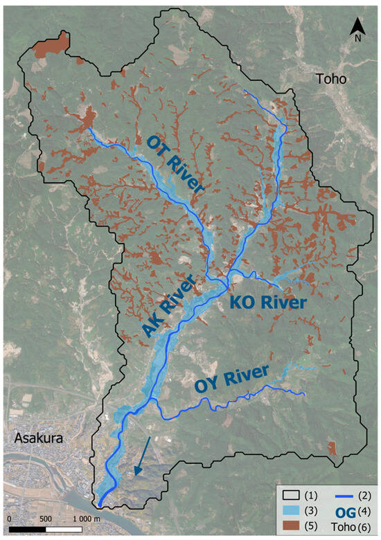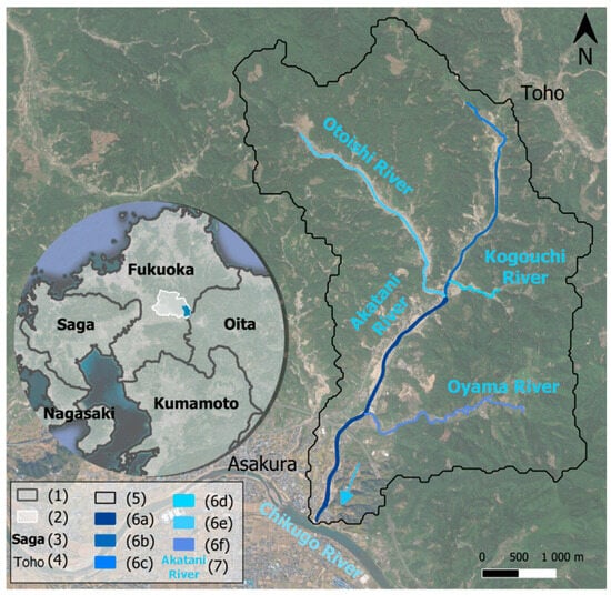 Location of AK watershed (approximately 20 km2). (1) Prefecture boundaries; (2) Asakura boundaries; (3) prefecture name; (4) toponym; (5) AK watershed; (6a) AK downstream; (6b) AK mid-stream; (6c) AK upstream; (6d) KO stream; (6e) OT stream; (6f) OY stream; (7) hydronym.