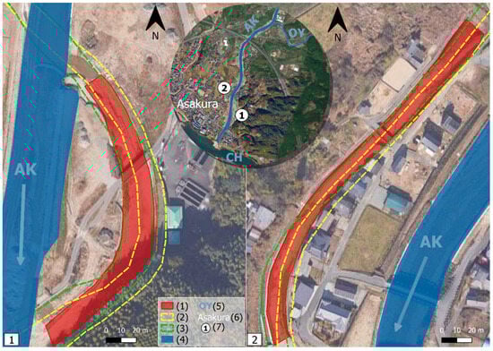 After J17, river channels were redesigned to “increase the reliability of flood control” by widening and straightening rivers [], increasing AK bankfull discharge from 50 m3/s to 330 m3/s at the CH’s confluence []. This evolution is detailed in Table 1 for each section presented in Figure 1.