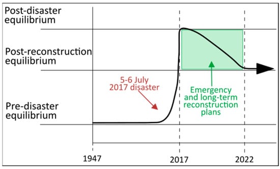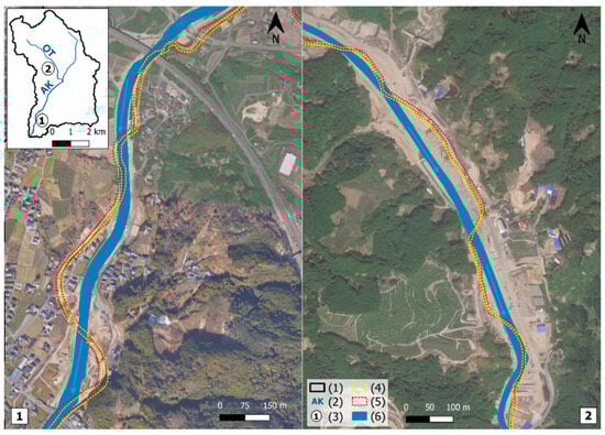 The J17 disaster can be considered as an LFHM hydroclimatic event. The disruption induced a different equilibrium from the previously existing one. Right after the crisis, aerial images showed a new river equilibrium with partly destructed river channels and an evolution of river style from single channels to braided ones. However, because of the necessity of reconstruction of the AK watershed, a new equilibrium was designed by the Japanese government. With the enlargement and the straightening of their channels, rivers are reaching a new balance between the pre- and post-disaster ones (Figure 8).