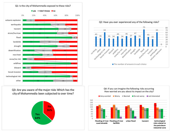 This area was specific to questions No. (1-2-3-4), which focused on the knowledge of the respondents about the dangers facing the city of Mohammedia, their previous experiences with it, and the extent of their concern in the event of some serious potential risks. Through question No. 1, it was found that the respondent group knows the potential risks in the city of Mohammedia; 46.13% answered yes, and 33.6% answered no, regardless of whether the answer was correct or not, but the percentage that drew our attention was the group that answered that it does not know, which was 19.4%. This category is the one that must be sensitized to the dangers facing the city of Mohammedia. In other words, question No. 3 was explicitly about the respondents’ knowledge of the major risks to which the city was exposed, as the results showed that 64% know the major risks that have occurred previously, compared to 36% who do not know about them. The conclusion from this question is that historical memory plays a role in remembering previous events, as the more the population remembers these incidents, the more prepared and aware they are, Ref. [10]. Question No. 4 shows the extent to which the population is concerned about some risks, and this shows the extent to which the population is aware of caution, anxiety, and attention to these risks; and the focus was only on those that threaten the city, and the results revealed that the technological risks related to the petroleum zone of the city and the risk of a tsunami have gained the attention of the respondents. They expressed that the respondents are very worried about their occurrence, and to a lesser extent about the flooding of the river Oued El Maleh; what is also noticeable is the presence of a category of those questioned who did not react to these risks and answered that they would be in such a normal position, without any concern in the case of potential risks.