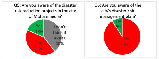 The extent to which the population knows about the projects and plans developed to reduce disaster risk is a positive indicator in the process of risk management in the event of an occurrence, as it makes it easier for the population to know the appropriate measures to take, as explained by questions No. (5–6) on the knowledge of the population of projects and plans (Figure 2). The results of these questions came as follows: the percentage of respondents who are aware of the projects completed to reduce disaster risk in the city of Mohammedia was 18%, and the percentage of those who are not aware of these projects was 42%, while 40% replied that they do not believe in the existence of these projects at all. For question No. 6, 9% said they knew about the city’s disaster risk management plan, while 91% of respondents said they did not know. This is a negative indicator, as a very large percentage does not know how to behave or where to go in the event of danger in the city.