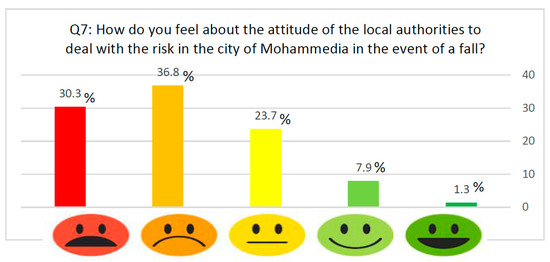 The feeling of confidence and security on the part of the population towards the local authorities in dealing with the risks is one of the most important factors of stability, spreading reassurance and not worrying the population. If this trust disappears, a set of negative outcomes may occur, such as panic, chaos, and bad organization [11]. This is what is stated in question No. 7 (Figure 3), where the respondents expressed how they felt about the behavior of the local authorities in dealing with the dangers in the city of Mohammedia in the event of an occurrence, and most of the results were largely negative: 30.3% answered that they felt very bad, 36.8% answered that they felt bad, while 1.3% said that they felt very good, and 7.9% said that they felt good about the disposal of the local authorities in the event of risks in the city. This negative feeling of the respondents, representing 74.3%, is a negative indicator, and indicates that any notification that may occur may not help regulate or calm the situation.