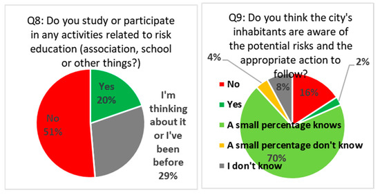 Awareness of the appropriate steps to follow during a disaster is one of the most important factors of survival, saving lives and reducing material damage; this is what is included in questions No. (8–9) (Figure 4). relation to the study or participation in activities related to risk awareness, 51% of the respondents replied that they are not studying or participating in risk education, compared to 20% who participate or study risk education.