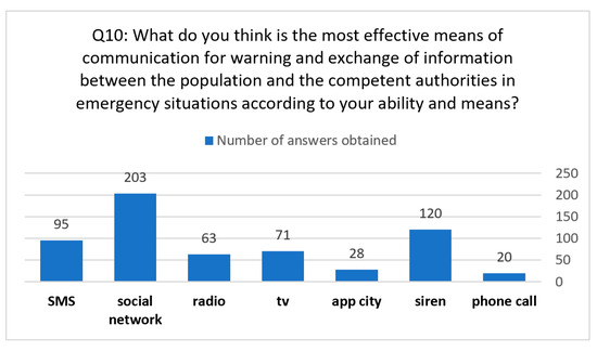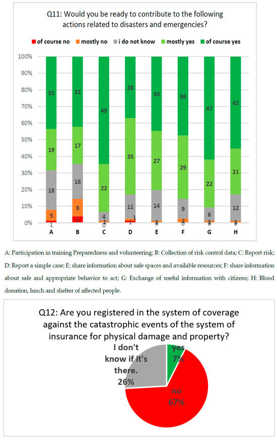 Questions No. (10-11-12) showed the extent to which the population is prepared to face risks, and what methods it prefers to use to communicate in critical cases (Figure 5). It can be a suggestion as to what the population prefers, as the respondents preferred social networking sites in the first place, and then sirens, and this is what the local authorities can work on to achieve effective communication and warning. One of the positive indicators that was identified in this questionnaire was solidarity and the readiness to help the population in case of danger; 70% of the respondents replied that they are fully prepared to participate in training, preparedness, the exchange of information, donation, etc., while only 9% were unwilling to participate in any of the proposals put forward and 21% did not know what they could or could not participate in them. With regard to insurance against catastrophic events, 7% of the respondents replied that they have it, unlike 67% of the respondents, whom we can integrate with the 26% who replied that they were not aware of its existence. This poses the following problem: Is the population aware of the existence of this insurance system or not?