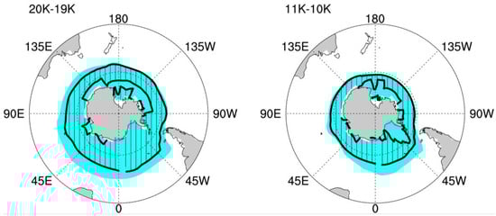 The Southern Hemisphere’s seemingly permanent sea ice coverage (blue color-shaded; fractional concentration) overlaps with the zone of surface buoyancy loss (black–shaded pattern) during the 20 K to 19 K and 11 K to 10 K periods.