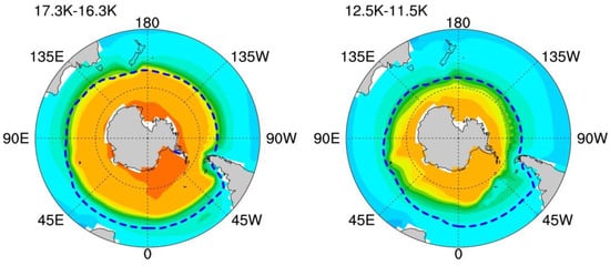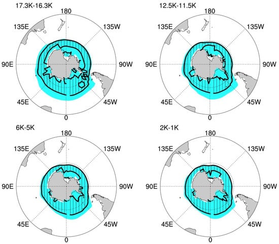 The 17.3 K to 16.3 K and 12.5 K to 11.5 K periods represent Northern Hemisphere cooling and, therefore, Southern Hemisphere warming periods (bipolar seesaw) []. Figure 2 shows the overlapping between the seemingly permanent sea ice–ocean edge and the borderline between the positive and negative buoyancy fluxes similar to the 11 K to 10 K periods. This shows the association of sea ice with surface buoyancy flux in the Southern Ocean during Southern Hemisphere warm events. Additionally, the inference stands true in the 6 K to 5 K and 2 K to 1 K periods, highlighting the association of sea ice with surface buoyancy fluxes throughout the past 20,000 years.