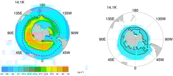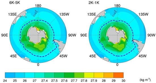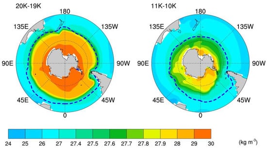 The density of the ocean’s surface is shown in color-shaded in kilogram per cubic meters units. The ocean surface density data are deduced by 1000, resulting in an ocean surface density of 27.6 for a theoretical ocean surface density of 1027.6 . The surface ocean density is overlaid on the annual mean sea ice–ocean edge (blue dashed line) during the 20 K to 19 K and 11 K to 10 K periods.